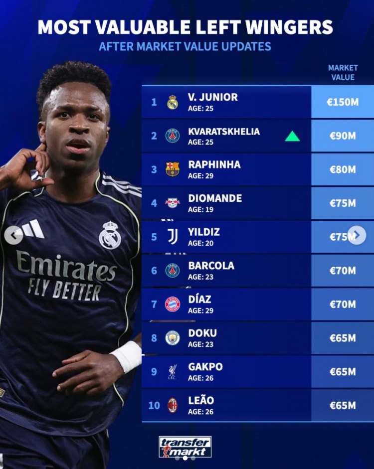 4月13日讯 德转更新了足坛左边锋身价情况,维尼修斯以1.5亿欧居首,K77以9000万欧位居次席。