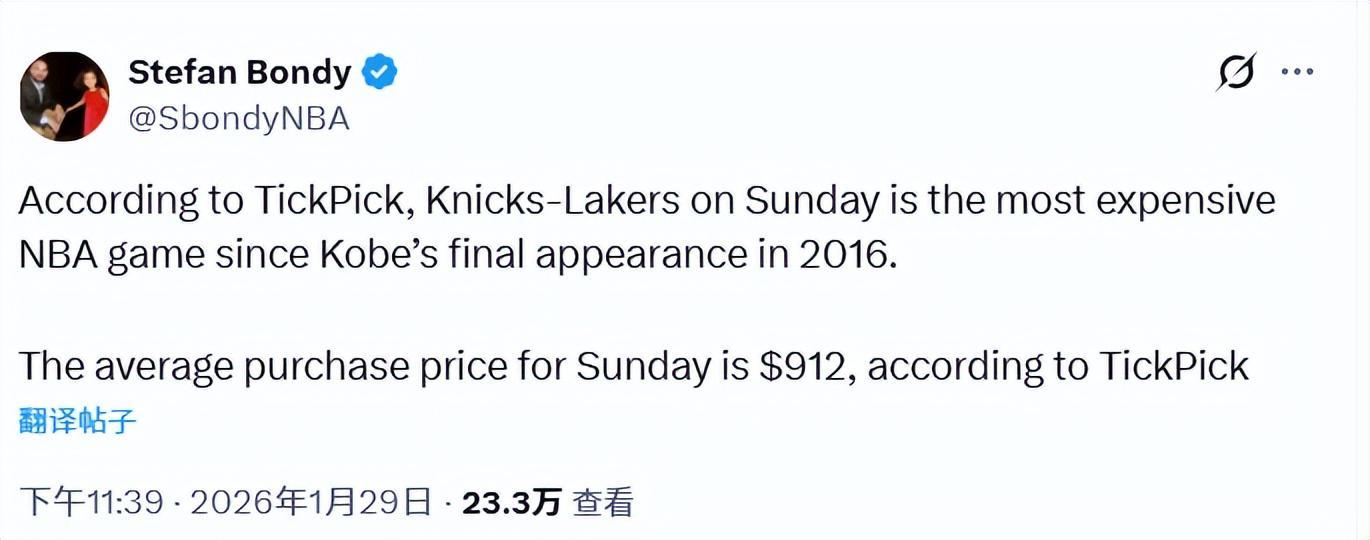 据票务平台Gametime的数据显示,湖人和尼克斯这场比赛的平均票价已高达912美元,这是自2016年4月13日科比退役之战(当时平均票价为1049美元)以来,NBA常规赛票价的最高纪录。而这场比赛的最低入场票价也达到了457美元。